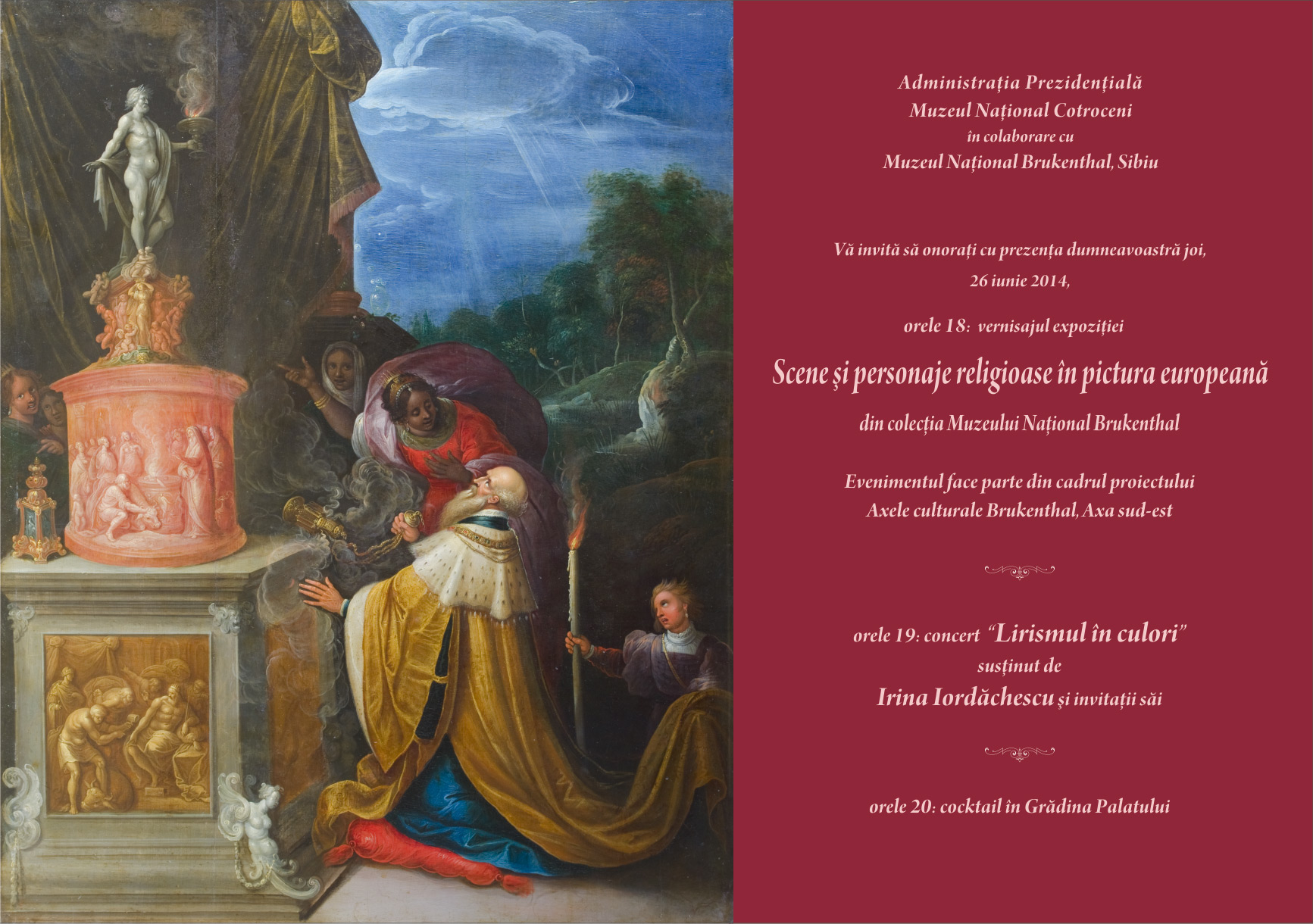 Avem placerea sa va invitam joi, 26 iunie 2014, orele 18.00, în Spaţiile Medievale ale Muzeului National Cotroceni la vernisajul expoziţiei „Scene şi personaje religioase în pictura europeană din colecţia Muzeului Naţional Brukenthal”. Expoziţia face parte din cadrul proiectului „Axele culturale Brukenthal – Axa Sud-Est”, iniţiat de Muzeul Naţional Brukenthal, Sibiu, proiect în cadrul căruia Muzeul Naţional Cotroceni este partener.
