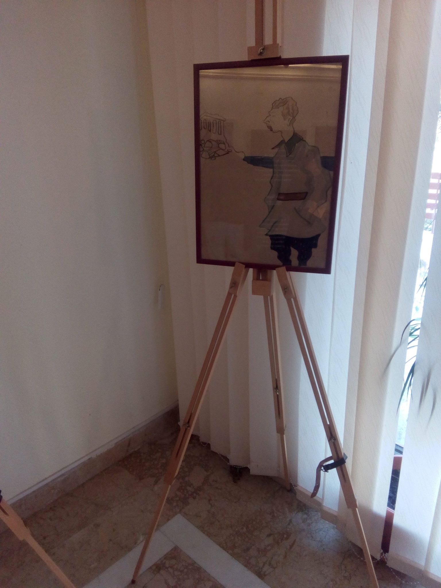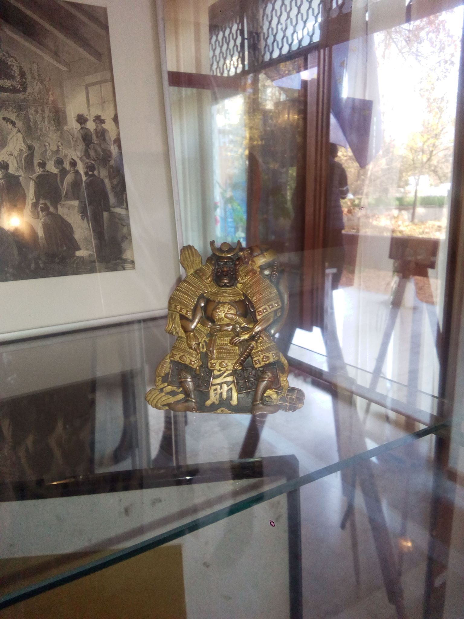Sculptura îl surprinde pe legendarul samurai într-o poziție de luptă, îmbrăcat într-un kimono uzual în ciuda portului samurailor a armurilor și măștilor, Musashi remarcându-se prin stilul său aparte, însă cele două săbii ale statuetei nu au trecut testul timpului nefiind expuse. Alături de aceasta au fost expuse, de asemenea, o serie de exponate tradiționale ale artei japoneze precum o miniatură a portului tradițional al samurailor, o statuetă a unui dragon, o hartă veche a Japoniei și o schiță a regelui Carol al II-lea vizitând Japonia.